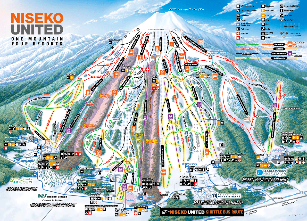Niseko United é conhecido por sua neve leve e seca, perfeita para freeride e esqui fora de pista. O resort oferece terreno para todos os níveis, desde áreas de aprendizado suaves até descidas técnicas para os mais experientes.
